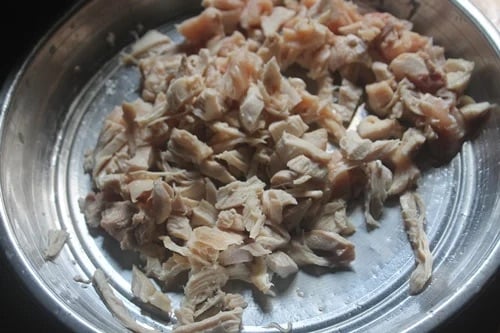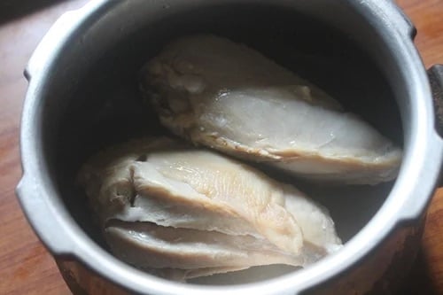 1)take chicken breast in a pressure cooker. Add salt, water and cover the cooker. Pressure cook for 2 to 3 whistle. Let the steam escape by itself. Open the cooker and remove the chicken. Allow it to cool.