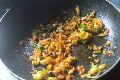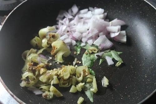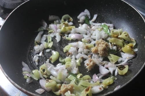 3)First make the filling. Heat oil in a pan, Add in onion, curry leaves and green chillies.
