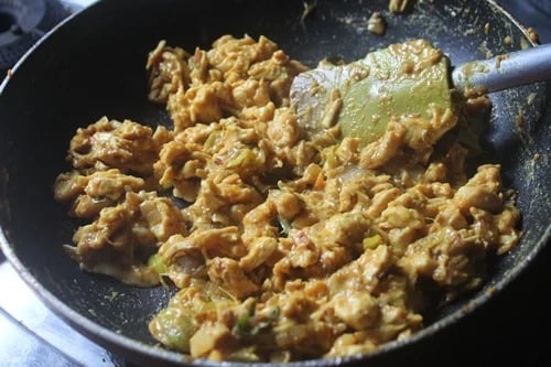 For the filling, the chicken is cooked until tender and then shredded before mixing with spices. And also its stock is reserved to add in the mixture to boost flavour.