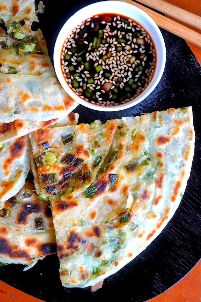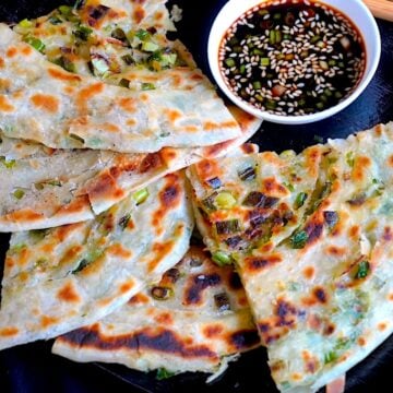 Serve the crispy and flaky scallion pancake hot with soy based dipping sauce, chilli oil, chilli sauce for authentic Chinese taste.Â