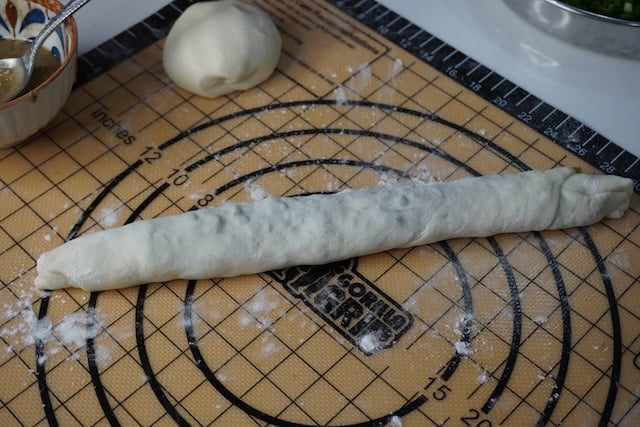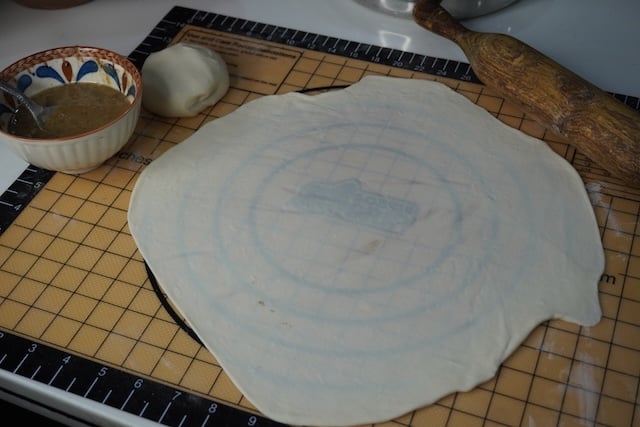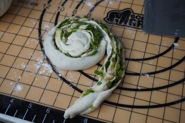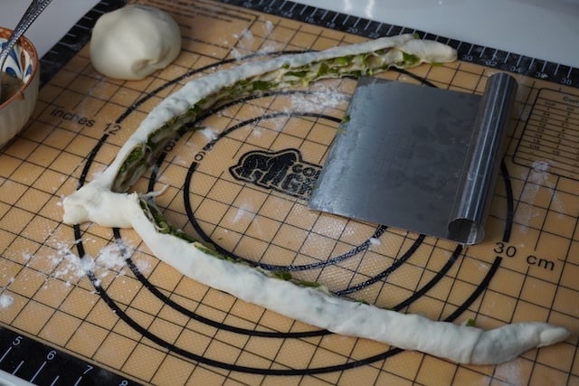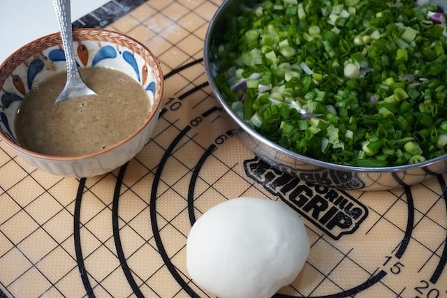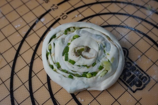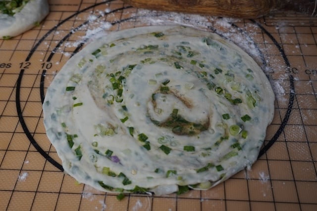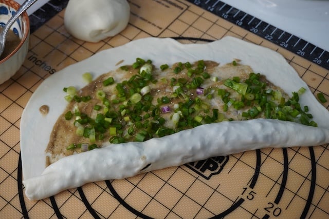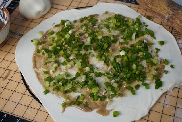 10)Now time to roll the pancake. Take your green onions, spice paste and the dough.