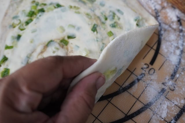 The dough is kneaded so soft then folded and layered with finely chopped scallions, which gives the pancake its signature flaky and flavourful taste.Â
