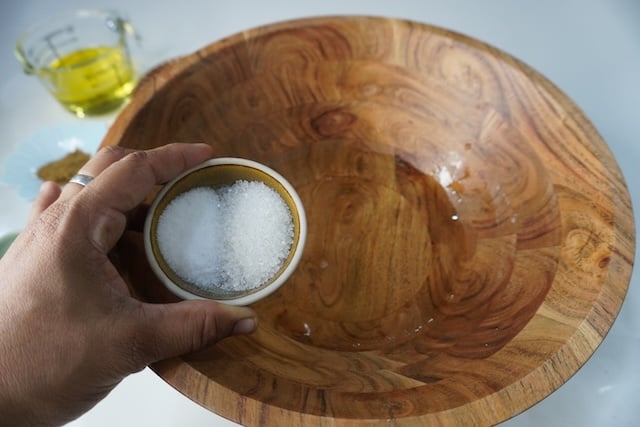1)Take water in a bowl. Add in salt and sugar to the water and mix well until the sugar is melted.