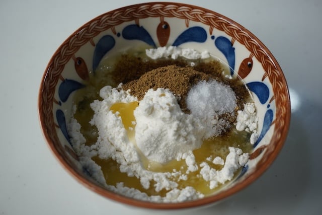 5)Take plain flour, salt, Chinese 5 spice powder, oil to make a paste. This is used to apply all over the rolled pancake.