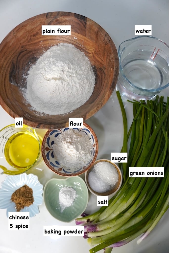 Scallion pancake or Spring onion pancake is a popular Chinese flatbread made with flour, spring onion, salt, Chinese 5 spice, baking powder, sugar and oil.