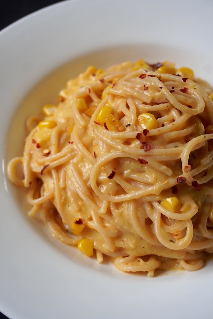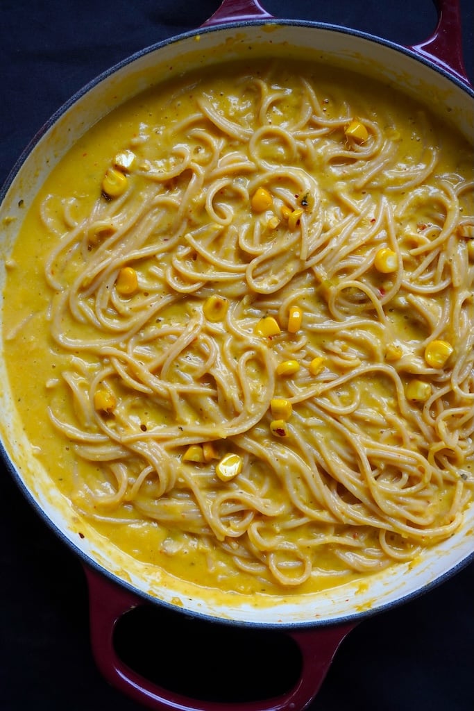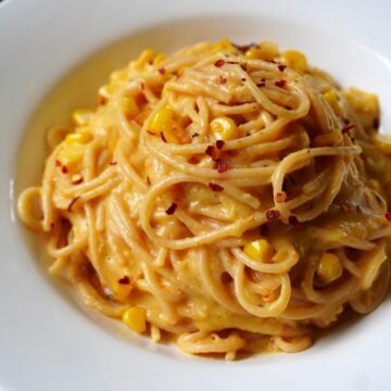 Corn pasta also known as sweet corn pasta is a delicious insanely creamy pasta made with just corn. You don’t need milk, cream or béchamel sauce to create the creamy texture.
