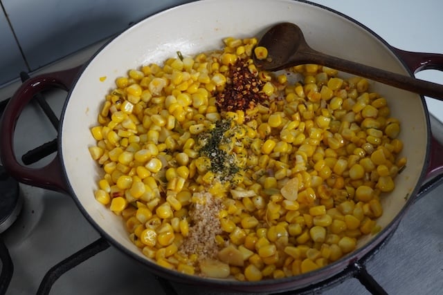 7)Now add in Italian seasoning, salt, red chilli flakes and mix into the corn.
