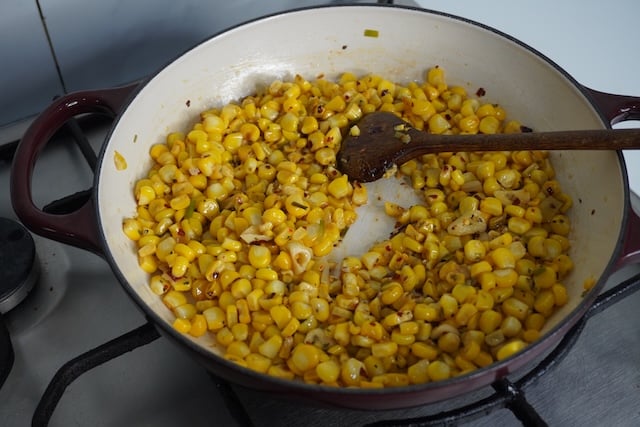 Now add in Italian seasoning, salt, red chilli flakes and mix into the corn. Take it off the heat, remove ¼ cup of the corn mixture in a separate bowl which we will add in the end. Allow the remaining corn to cool for a bit before adding into the blender jar.