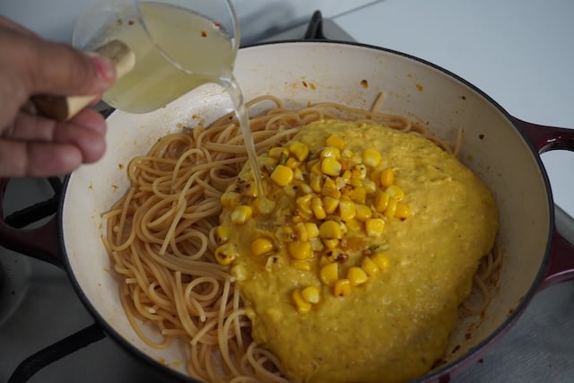 Now take the cooked pasta in the same pot in which you sautéed corn. Add in the corn sauce, reserved sautéed corn, more pasta cooking liquid and mix well till it get creamy and saucy. You can add more pasta water as needed.