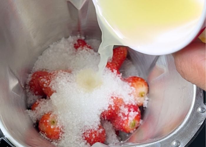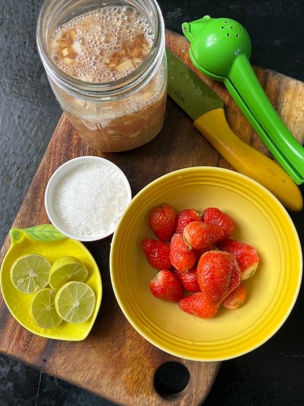 8)Take your ingredients for soda. I am making strawberry soda. So i am using strawberries, sugar, lemon juice, water and ginger bug.