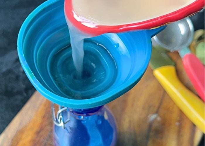14)Now take a flip top glass bottle. Pour strained ginger bug into the bottle.