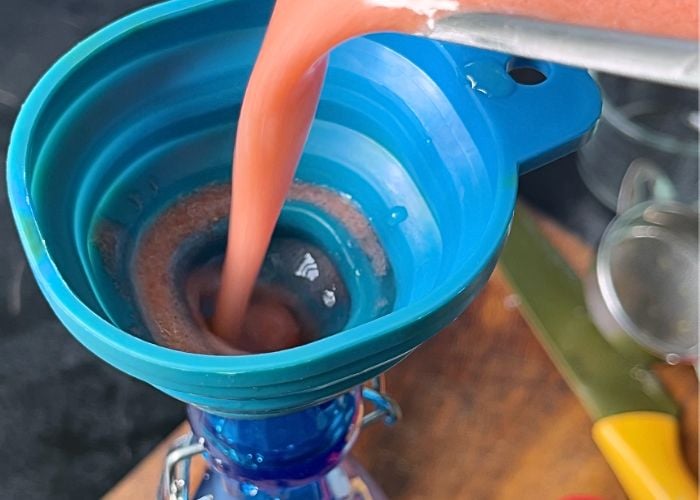 15)Pour strawberry juice through funnel. Fill the juice till top leaving 2 inches of space on top. Shake once and cover the bottle. Cover and leave for 1 day.