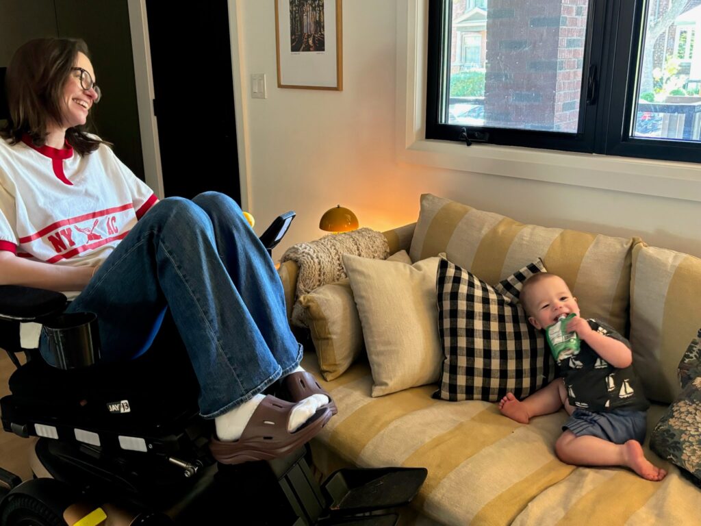 It’s post-nap. My 18-month-old son opens his dresser, takes out one shirt at a time, and places them around the room: a yellow shirt in the corner, the denim oxford on my knee, and a ringer tee on his head. Drawer emptied, I ask him to climb onto my lap, and he plants one dumpling foot on my wheelchair’s frame, then stretches his other up to the cushion behind my shins. He flops his belly on my legs, and I drag him into a sitting position. His 97th percentile-sized head rests against my chest, and he points around the room, counting to five for no reason.
