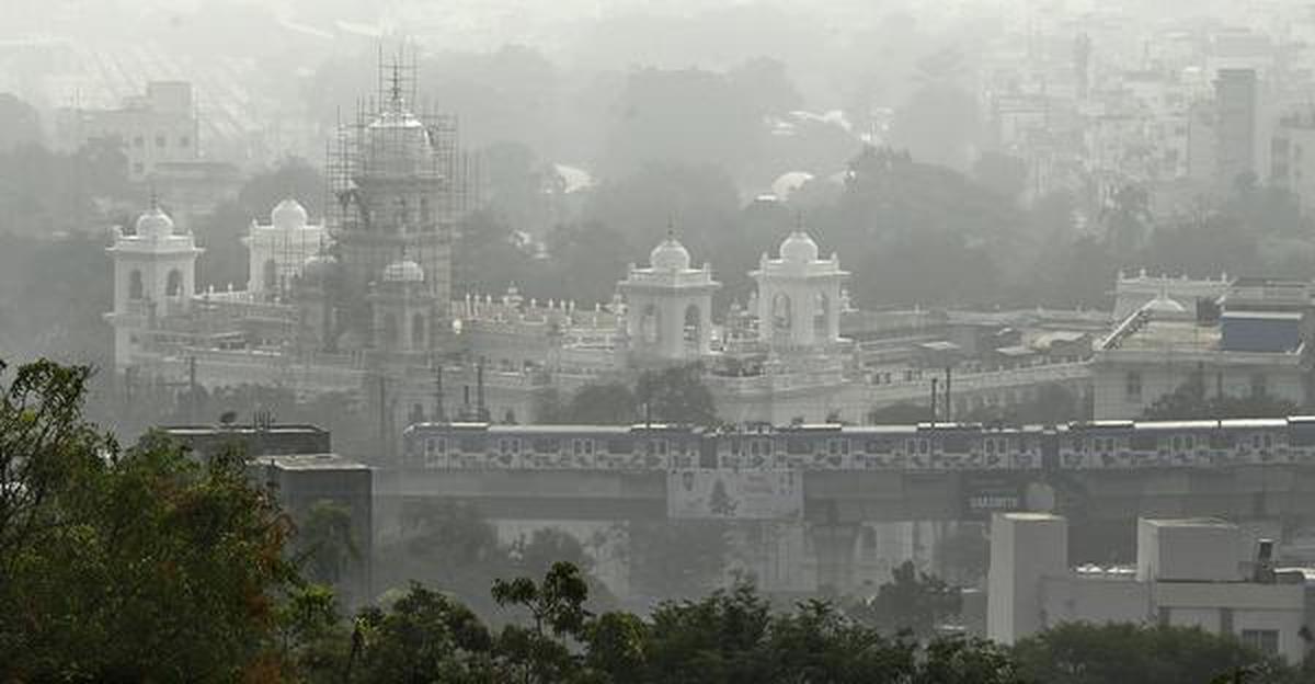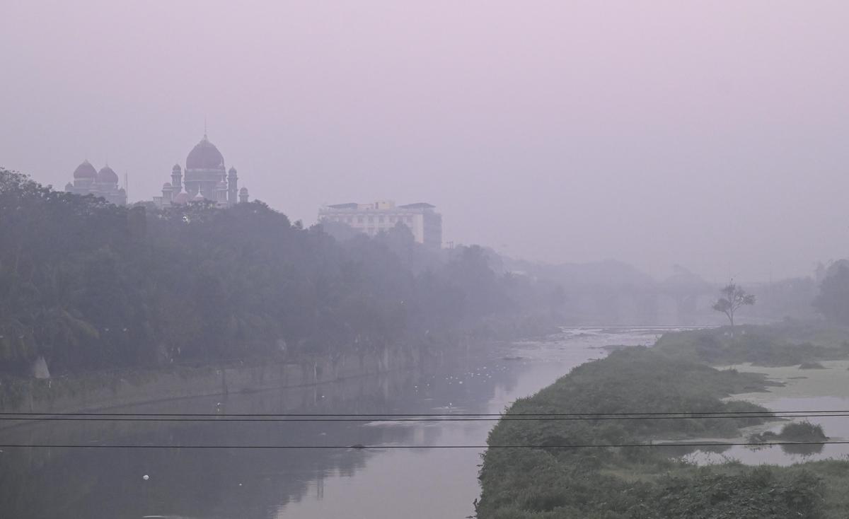 Dense fog envelops the Telangana High Court along the Musi river in the early hours in Hyderabad on Tuesday (December 30, 2025)