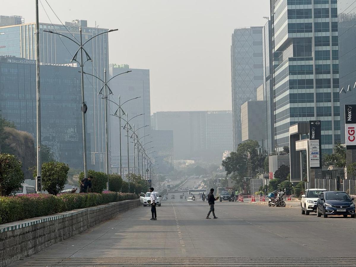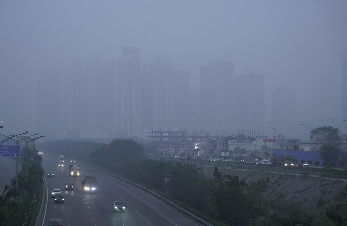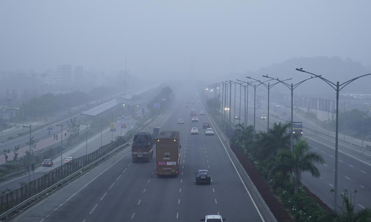 Morning fog blankets Puppalguda, shrouding roads and buildings in Hyderabad on Saturday (January 3, 2026.).