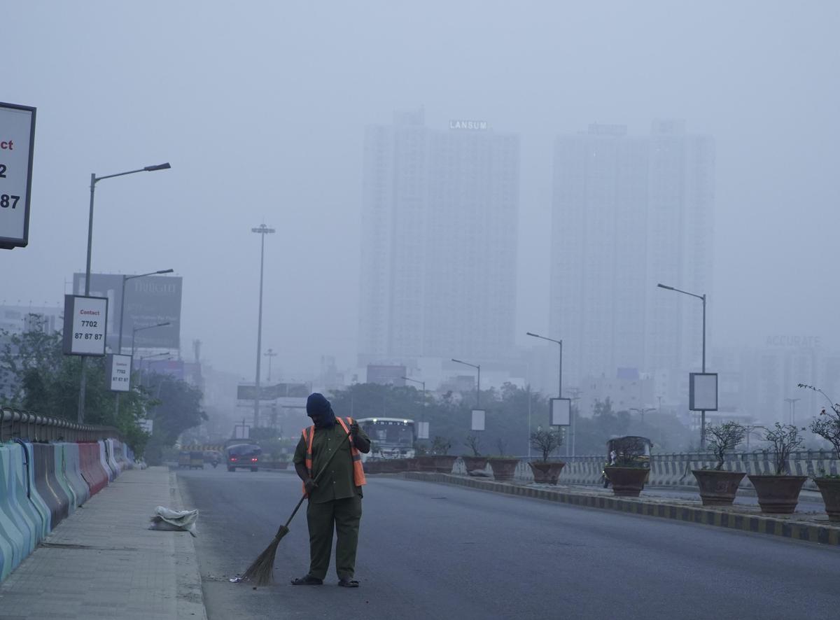 A sanitation worker sweeping road amidst thick fog which enveloped Narsingi, shrouding roads and buildings in Hyderabad on Saturday (January 3, 2026)
