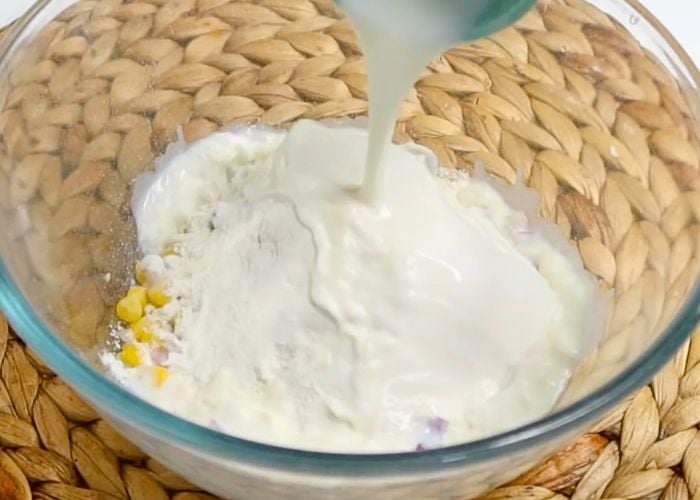 2)Add in flour, milk to the corn. You can add some cornstarch into the batter.