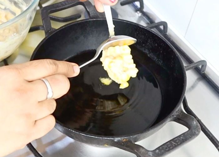 5)Heat oil for deep frying. Now take a spoonful of this batter and drop in hot oil.