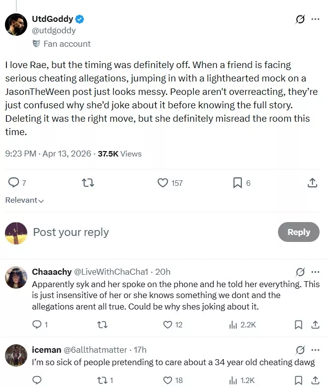 “I love Rae, but the timing was definitely off. When a friend is facing serious cheating allegations, jumping in with a lighthearted mock on a JasonTheWeen post just looks messy. People aren’t overreacting, they’re just confused why she’d joke about it before knowing the full story. Deleting it was the right move, but she definitely misread the room this time.”