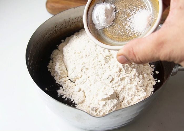 8)Add in whole wheat flour, salt, baking powder into the sauce pan. Mix until a smooth batter is formed.