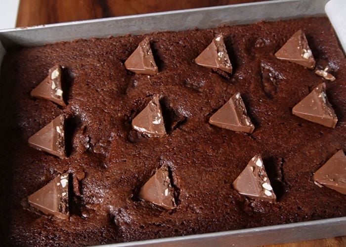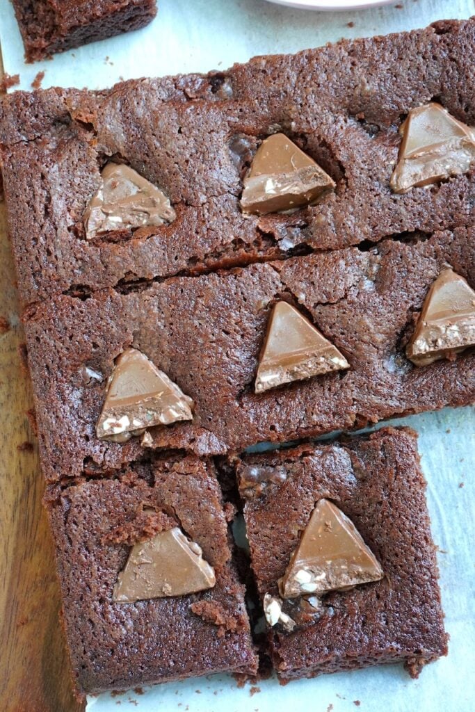 13)Remove from oven and top with chopped chocolate or Toblerone while the brownie is still hot. Press the chocolate lightly so it sticks to the brownies.