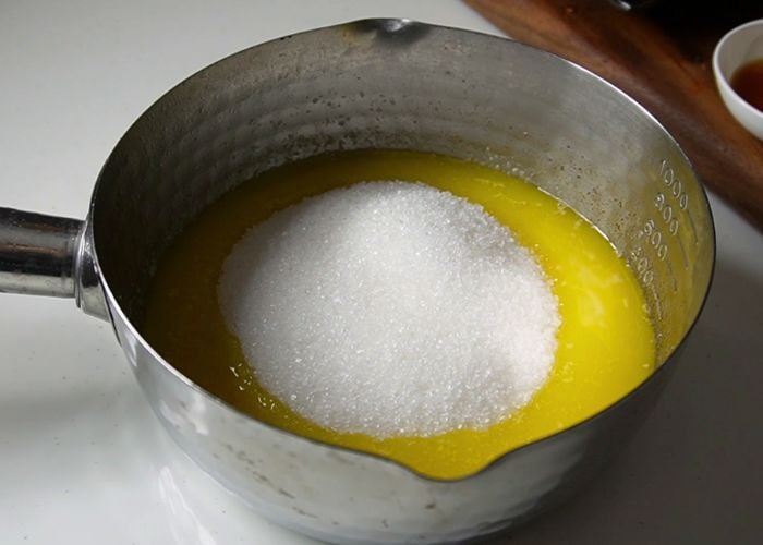 3)Add in sugar into the melted butter. Mix until the sugar is combined with melted butter.