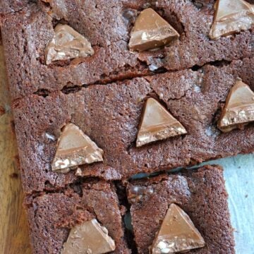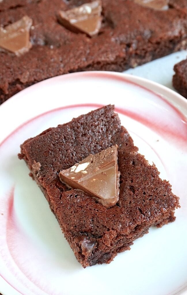 Whole wheat brownies, the best recipe for a fugdy, chocolaty brownie recipe that is made with wheat flour, butter, sugar, cocoa, milk, baking powder and salt. The brownies are topped with chopped toblerone chocolate to create decadent brownie squares.