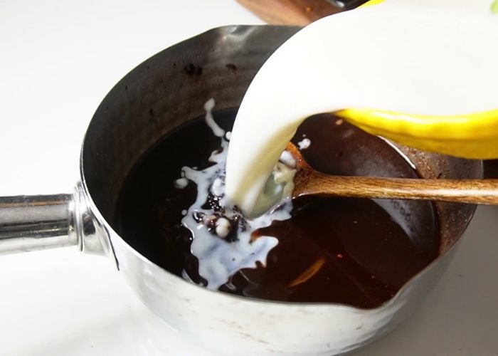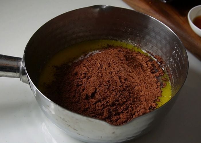 4)Add in unsweetened cocoa powder into the sauce pan and mix until the cocoa is combined with butter.