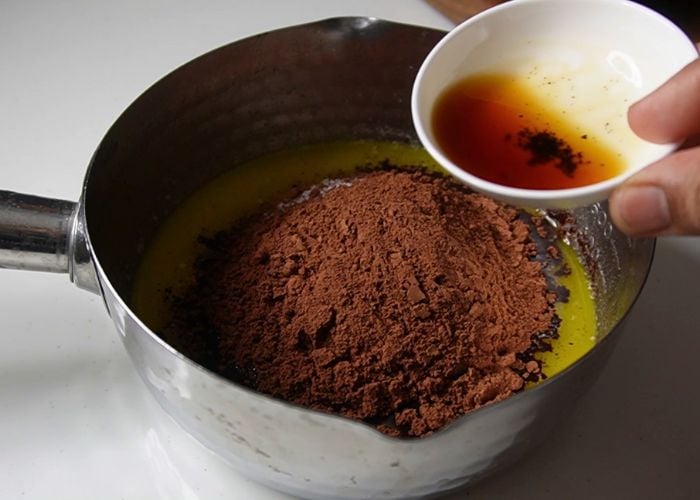 5)Add in vanilla extract and mix well. Let the cocoa powder bloom in the warm butter.