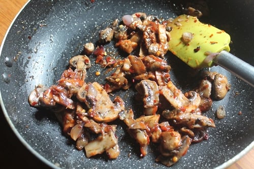 4)Saute them together on high heat. The mushroom will leave out some of their water. Let it get dried up.